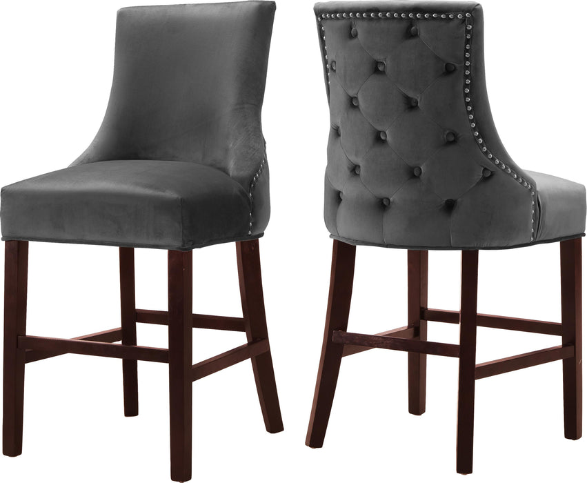 Add this Hannah Grey Velvet Stool to your home bar or kitchen counter to seat guests comfortably and in chic fashion. The grey velvet upholstery is thick and durable and has a slight sheen for a touch of glam. The back of the seat has deep button tufts for a posh look, while the front features smooth velvet upholstery for sleek comfort. The base is made from wood with an espresso finish and has a foot rail for extra support and comfort as you sit.