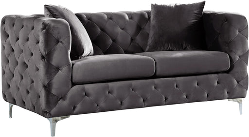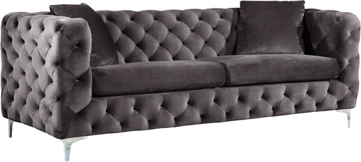 Sink into the welcoming comfort of this Scarlett navy velvet chair. This chair defines elegance and sophistication with its boxy retro look and its deeply tufted upholstery that covers every inch of the sides, back, and front. The navy velvet material feels luxurious to the touch while the chromed legs lend the chair sturdy support and a modish finish. Pair it with other items in the Scarlett collection for a complete look.